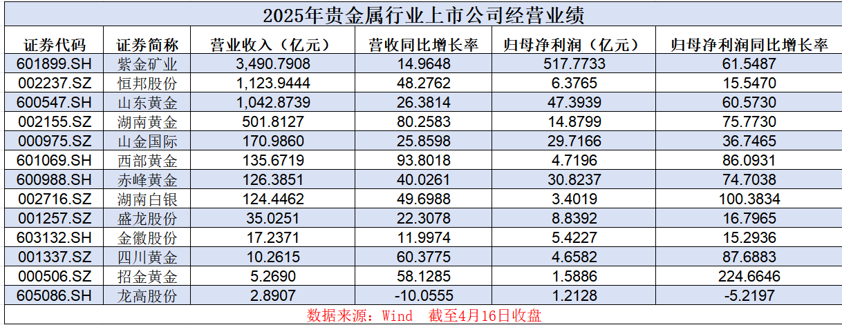 在此背景下,A股贵金属板块迎来了一轮强势的“戴维斯双击”。按照Wind行业分类统计,截至4月16日收盘,有13家贵金属上市公司交出了2025年成绩单。其中有12家实现营业收入与归母净利润双增长,多家有突出贡献的公司营收突破千亿元,还有多家公司去年股价翻倍,今年继续“高歌”,贵金属板块无疑成为当下A股市场最亮眼的赛道之一。